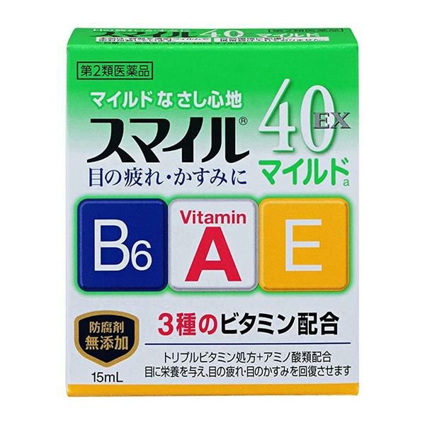 他の画像を見る 目の疲れ・かすみに 【第2類医薬品】 スマイル40EX マイルドa 15mL 目薬 - ライオン ※ネコポス対応商品 [目薬/目の疲れ] 販売価格 ¥ 412 税込 ネコポス便対応品 「スマイル40EXマイルド 15mL」は、角膜細胞の正常な働きを助ける「ビタミンA」(40EXa・40EXマイルドa:3万単位、40EX クール:1万単位)に加え、「ビタミンE」、「ビタミンB6」を配合。 詳細を見る お気に入りに登録する
