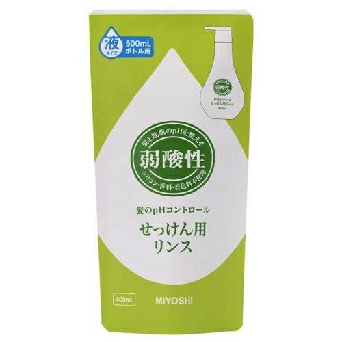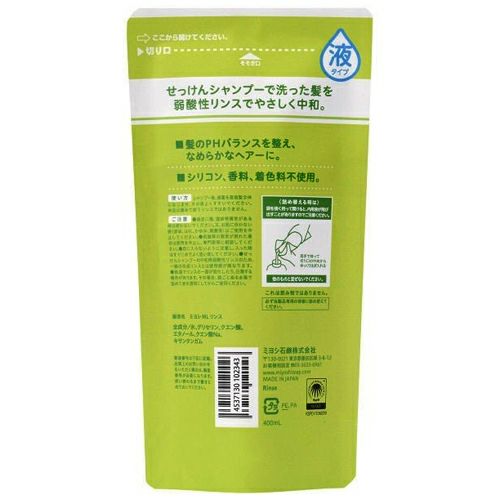 他の画像を見る ミヨシ 弱酸性 無添加せっけん用リンス リフィル 400ml - ミヨシ石鹸 定価 ¥ 605 販売価格 ¥ 574 税込 在庫切れ 「ミヨシ 弱酸性 無添加せっけん用リンス リフィル 400ml」は、せっけんシャンプーでアルカリに傾いた髪を、クエン酸のチカラで中和する専用リンスです。 再入荷お知らせ お気に入りに登録する