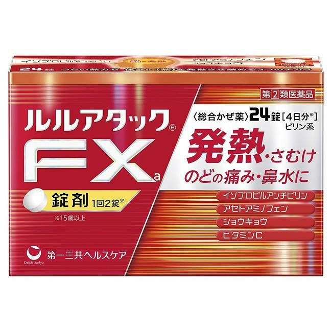 他の画像を見る だるさを伴う熱風邪に 【指定第2類医薬品】 ルルアタックFxa 24錠 - 第一三共ヘルスケア [セルフメディケーション税制対象] [風邪薬/のどの痛み] 定価 ¥ 2,200 販売価格 ¥ 1,986 税込 「ルルアタックFXa 24錠」は、かぜによる発熱時の解熱メカニズムに着目した独自処方の総合かぜ薬です。 詳細を見る お気に入りに登録する