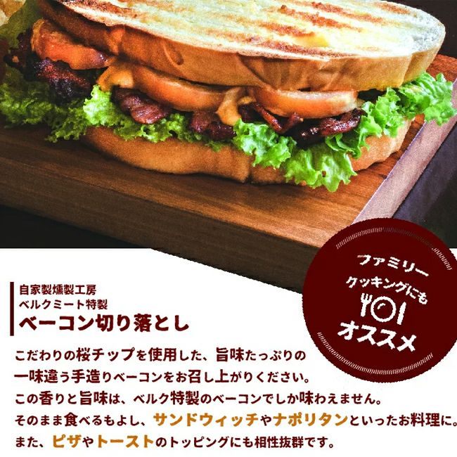 他の画像を見る メーカー直送[産直] 九州産。本場ドイツ秘伝のこだわり製法だから違う! 九州産 ベーコン切り落とし 500g×2(約1Kg) - ベルクミート [燻製/ソーセージ] ※クール便冷蔵 クール便でお届け 販売価格 ¥ 3,672 税込 送料無料 在庫切れ 「九州産 ベーコン切り落とし 500g×2(約1Kg)」は、こだわりの桜チップを使用した旨みたっぷりの一味違う手造りのベーコンです。 詳細を見る お気に入りに登録する