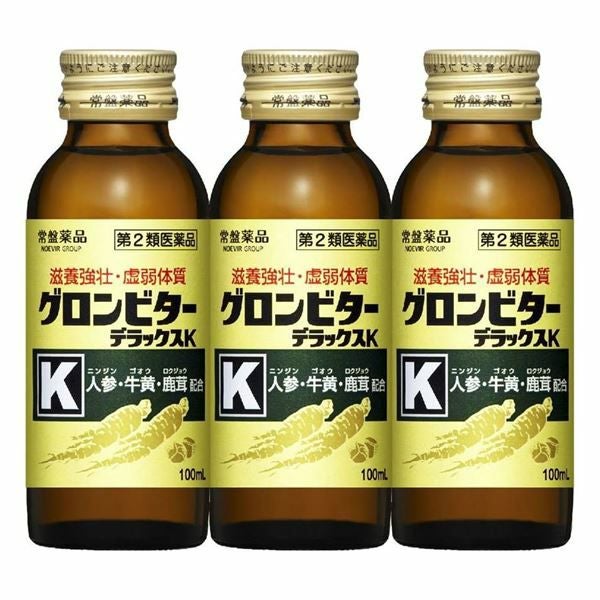 他の画像を見る 滋養強壮・虚弱体質に 【第2類医薬品】 グロンビターデラックスK 100ml×3本 - 常盤薬品工業 [肉体疲労/滋養強壮] 定価 ¥ 1,650 販売価格 ¥ 990 税込 会員価格あり 「グロンビターデラックスK」は、強壮生薬として知られている、ニンジン、ゴオウ、鹿茸、イカリソウ、クコシをはじめ、ビタミンB群のB1(チアミン硝化物)、B2(リボフラビンリン酸エステルナトリウム)、ニコチン酸アミド、イノシトールを配合した滋養強壮薬です。 詳細を見る お気に入りに登録する