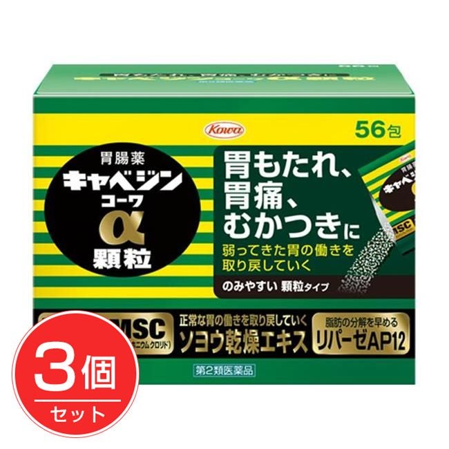 他の画像を見る 胃もたれ、胃痛、むかつきに 【第2類医薬品】 キャベジンコーワα顆粒 56包×3個セット - 興和 [数量限定セール] [食べ過ぎ/飲み過ぎ] 定価 ¥ 7,755 販売価格 ¥ 5,907 税込 会員価格あり 送料無料 「キャベジンコーワα顆粒 56包」は、動きの鈍ってきた胃を元気に動かし、正常な胃の働きを取り戻してくれます。 詳細を見る お気に入りに登録する