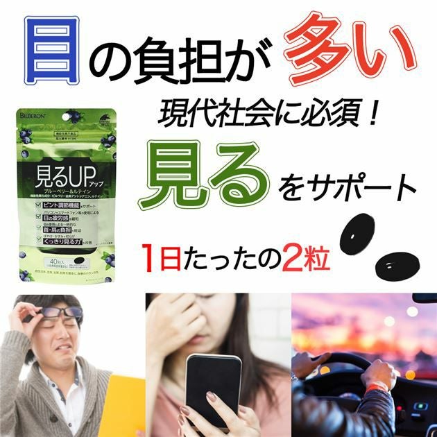 他の画像を見る 目のピント調節やクッキリ見るをサポート 見るアップ ブルーベリー&ルテイン 40粒 (20日分) [機能性表示食品] - ユニマットリケン [目のピント調節/目の疲労感軽減] ※ネコポス対応商品 定価 ¥ 1,814 販売価格 ¥ 1,698 税込 会員価格あり 送料無料 ネコポス便対応品 在庫切れ 「ユニマットリケン 見るアップ ブルーベリー&ルテイン 40粒 [機能性表示食品]」は、ビルベリーとルテインを配合し、ピント調節機能をサポート、目の疲労感を緩和、ぼやけ・かすみを和らげくっきり見る力(コントラスト感度)を改善する機能性表示食品です(届出番号 H1399)。 再入荷お知らせ お気に入りに登録する