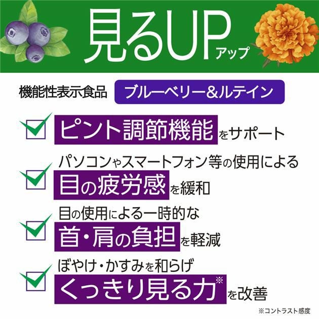 他の画像を見る 目のピント調節やクッキリ見るをサポート 見るアップ ブルーベリー&ルテイン 40粒×6個セット (合計120日分) [機能性表示食品] - ユニマットリケン [目のピント調節/目の疲労感軽減] ※ネコポス対応商品 定価 ¥ 10,886 販売価格 ¥ 8,100 税込 会員価格あり 送料無料 ネコポス便対応品 在庫切れ 見るアップ ブルーベリー&ルテイン 40粒×6個セット (合計120日分) [機能性表示食品]」は、ビルベリーとルテインを配合し、ピント調節機能をサポート、目の疲労感を緩和、ぼやけ・かすみを和らげくっきり見る力(コントラスト感度)を改善する機能性表示食品です(届出番号 H1399)。 再入荷お知らせ お気に入りに登録する