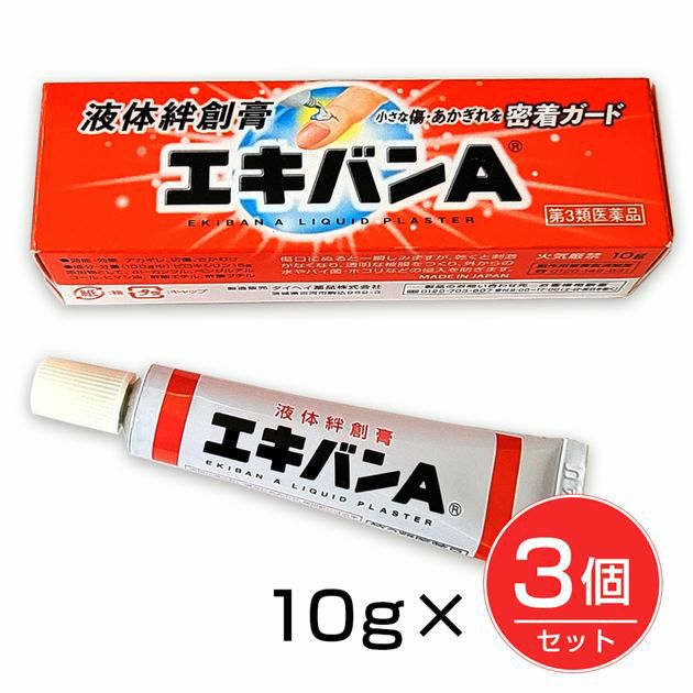 他の画像を見る 液体絆創膏 【第3類医薬品】 エキバンA 10g×3個セット - タイヘイ薬品 ※ネコポス対応商品 [ささくれ/ひび割れ] 定価 ¥ 3,234 販売価格 ¥ 1,870 税込 会員価格あり 送料無料 ネコポス便対応品 「エキバンA」は、傷口に塗布すると透明な被膜を形成し、外からの水やバイ菌・ホコリなどの侵入を防ぐ液体絆創膏です。 詳細を見る お気に入りに登録する