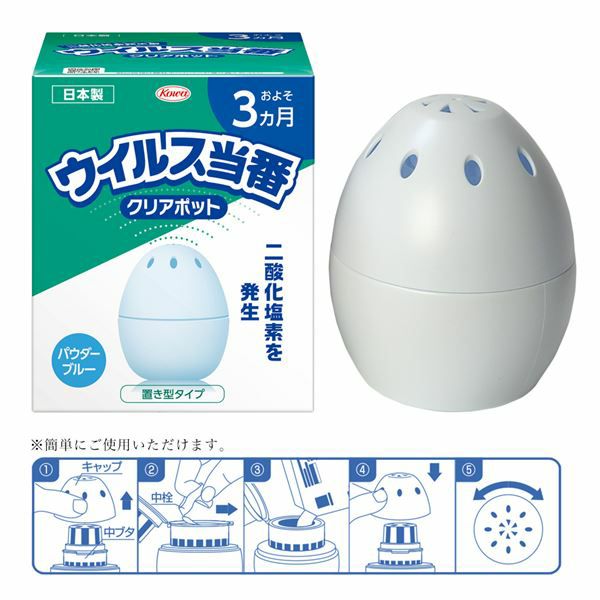 他の画像を見る 置くだけウイルス対策。3か月用 ウイルス当番クリアポット およそ3カ月用 150g×2個セット ※新パッケージ - 興和 定価 ¥ 4,840 販売価格 ¥ 3,800 税込 送料無料 在庫切れ 「ウイルス当番 クリアポット およそ3カ月用 150g×2個セット」は、二酸化塩素を発生させます。 再入荷お知らせ お気に入りに登録する