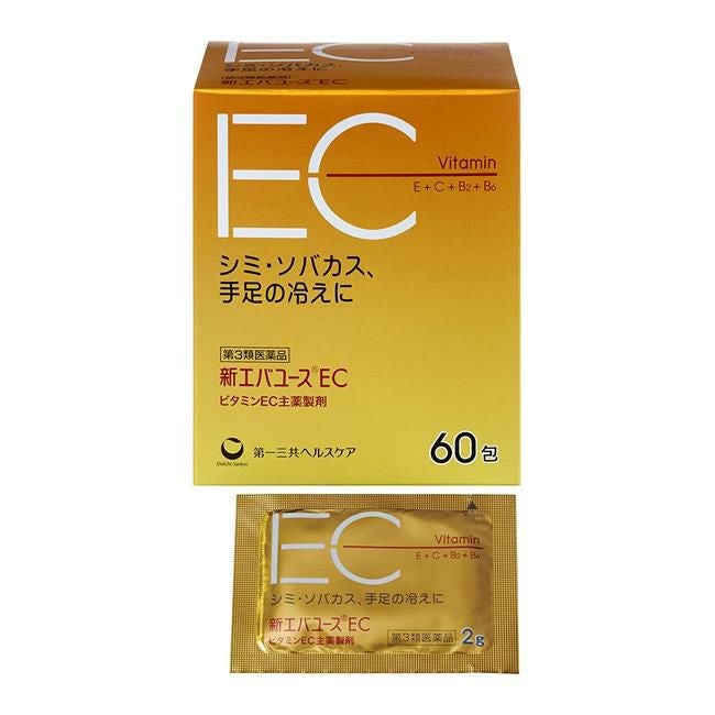 他の画像を見る しみ・そばかす、手足の冷えに 【第3類医薬品】 新エバユースEC 60包 - 第一三共ヘルスケア [ビタミンEC/しみ] 定価 ¥ 4,620 販売価格 ¥ 2,178 税込 「新エバユースEC 60包」は、主薬であるビタミンCがしみの原因となるメラニンの生成をおさえてコラーゲンの生成を助け、天然型ビタミンEが末梢の血行を改善して新陳代謝をスムーズにし、出来てしまったシミの症状緩和につながります。 詳細を見る お気に入りに登録する